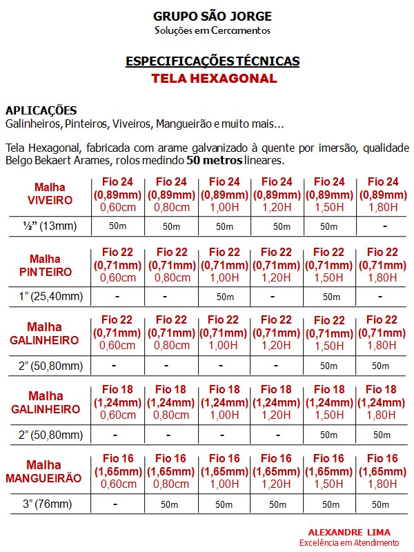 Suas principais aplicações são em galinheiros, pinteiros, viveiros, mangueirões e muito mais. Tela hexagonal, fabricada com arame galvanizado a quente por imersão, qualidade Belgo Bekaert Arames em rolos medindo 50 metros lineares.